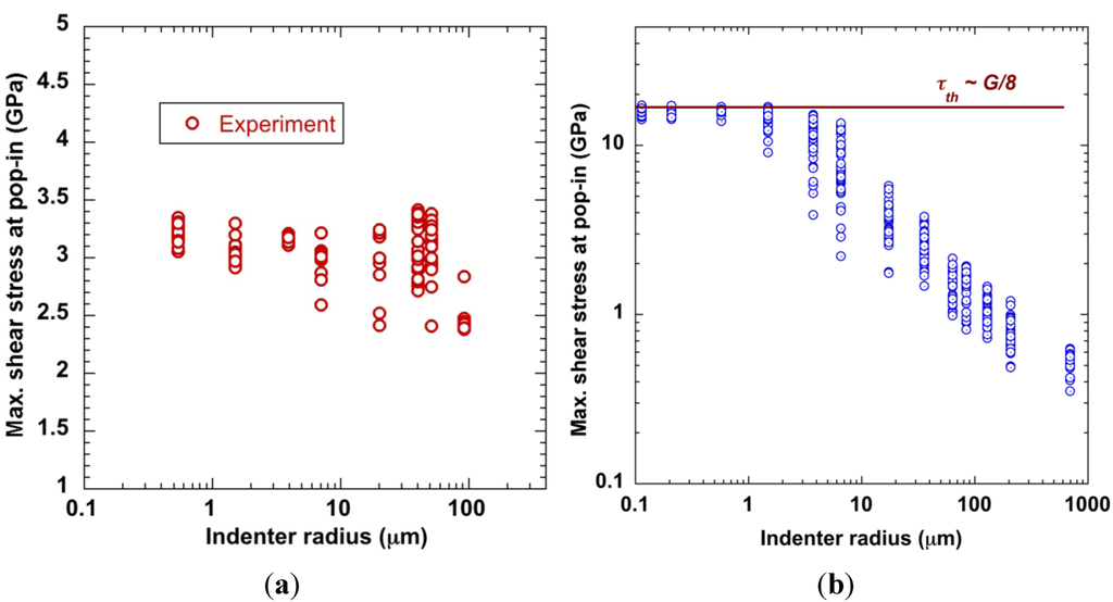 (a) Maximum shear stress at first pop-in for Zr52.5Cu17.9Ni14.6Al10Ti5 as a function of indenter radius [54]. The shear modulus is 35 GPa, so the pop-in strain is about 8% to 9%, whereas the macroscopic yield strain is 2%. (b) The pop-in stress against the indentor radius for crystalline Mo [55].
