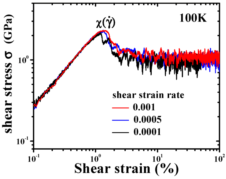 Teff has a critical role in the stress-strain curve. To see this effect clearly we have to suppress formation of shear bands and study the stress-strain curve for homogeneous deformation. This can be done, in principle, with a very small sample, or more easily with computer simulation. In computer simulation the sample size is usually small, and by using specific boundary conditions deformation can be kept homogeneous. The system is deformed with a constant strain rate, not by a constant stress. In such a case, the yield stress, σY, the stress needed to start plastic deformation, is much higher than the flow stress, σf; the stress necessary to maintain the flow at low temperatures (Figure 12 [60]). This is because up to σY deformation is basically elastic, and the structure, defined by the topology of atomic connectivity, remains unchanged. This means that the effective temperature, Teff, remains unchanged up to yielding. But as soon as yielding starts the energy is transferred to the system through mechanical work, and Teff starts to rise. The rise in Teff results in the reduction in viscosity, and faster flow. If the local flow rate becomes higher than the externally imposed strain rate the stress is relaxed and goes down, until the steady state flow is achieved. In the particular case shown in Figure 12 σY is twice as much as σf.