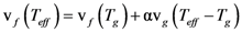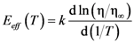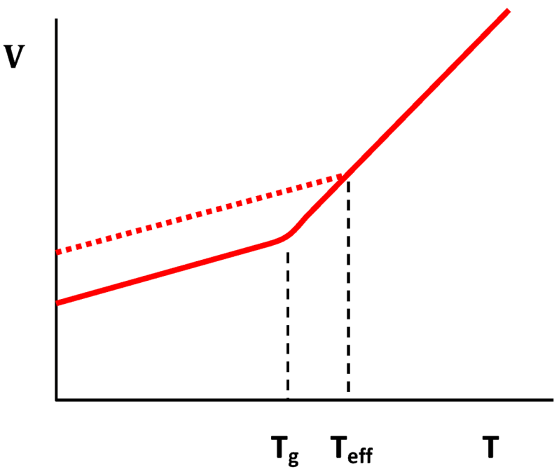 where η∞ is the viscosity extrapolated to T→∞, Eeff is constant at high temperatures, but quickly increases as T approaches the glass transition [57]. So Teff can be defined by Ea = Eeff(Teff), where Ea is the activation energy for viscosity, for a given structure. In glass science Teff is traditionally called the fictive temperature, Tf. Another way to define ϕ is to consider the inherent structure [58]. The inherent structure is the atomic structure obtained by equilibriating the system at temperature T and quenching it extremely fast, which is possible only with computer simulation. The energy of the inherent structure describes the structure at the temperature T from which the system was quenched [59]. When temperature is changed the structure, thus Teff, changes to a new equilibrium. Except at very high temperatures this change is slow, and is characterized by the structural relaxation time τα.