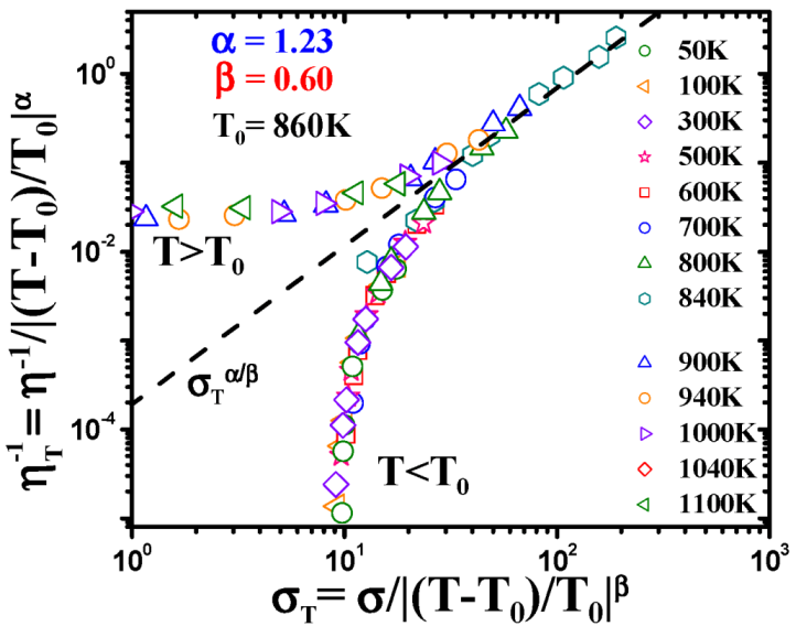 (a) Schematic deformation map of a metallic glass by Spaepen [7]. τ is the shear stress, and μ is the shear modulus. (b) Experimental data for Pd80Si20 [51].