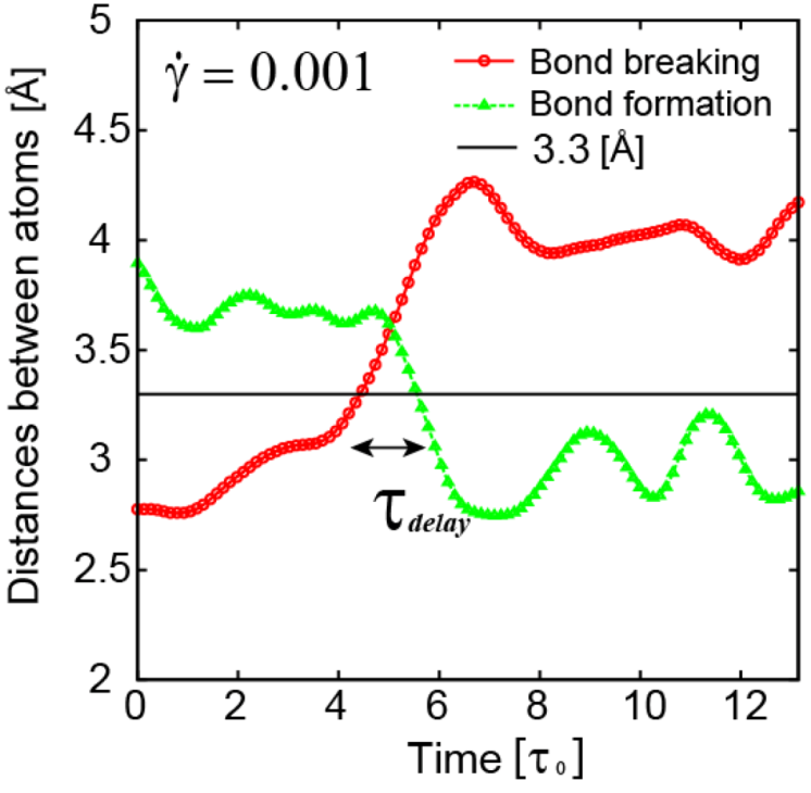 On the other hand Suzuki et al. [19] found that the nominally elastic deformation contains a significant component of anelastic, or local plastic, deformation in which the atomic structure is locally changed. Similar observations were made for the simulation of deformation of polymer chains [20]. The plastic deformation event is strongly localized, and consists of one atomic bond being broken, while a new bond in a perpendicular direction is formed in close vicinity, resulting in bond exchange, or reorientation. This is what happens during creep [21,22,23] or flow under high shear stress [24]. Interestingly the number of bond reorientation for a given strain is constant, making the deformation appearing as macroscopically elastic [19].