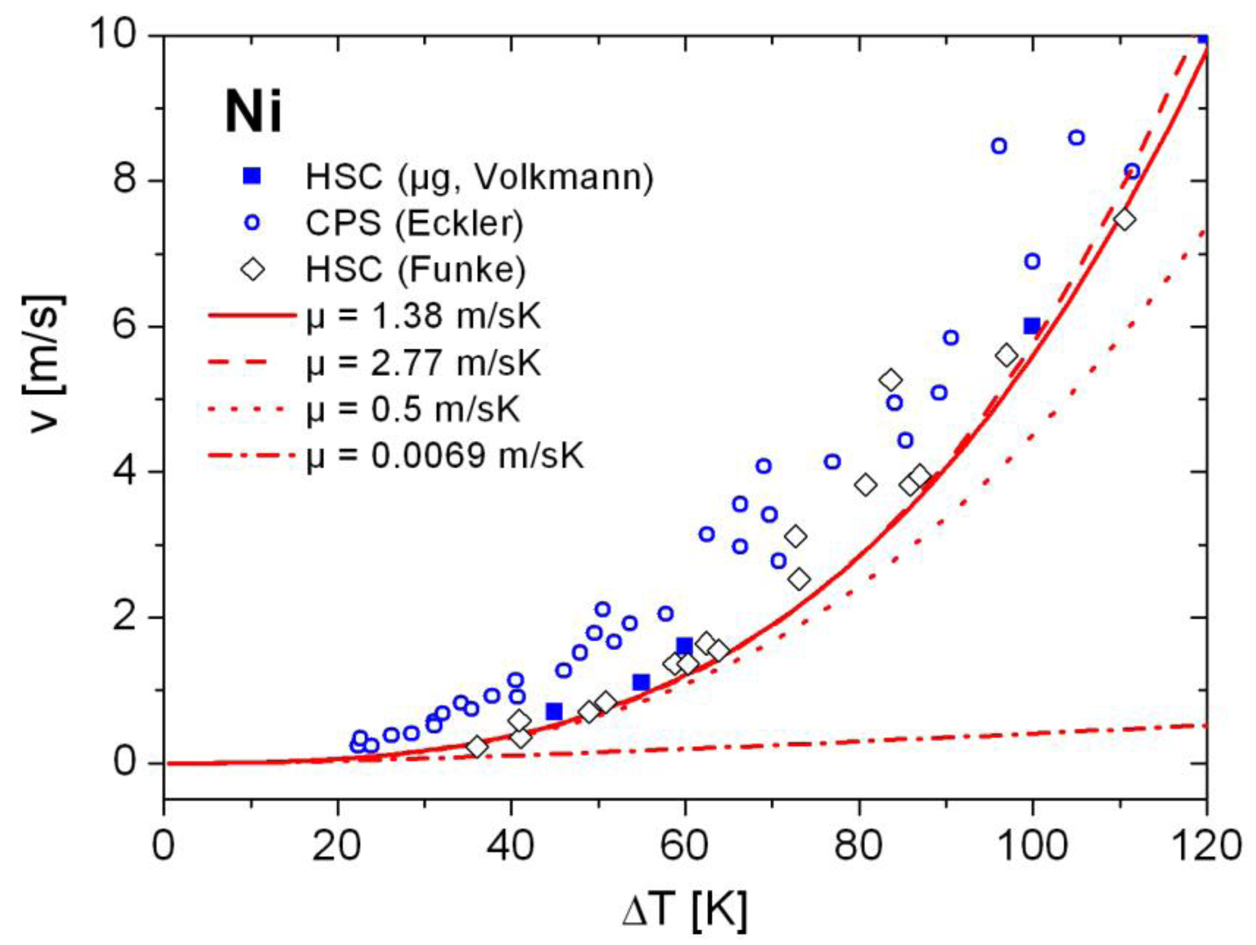 - Funke, O.; Phanikumar, G.; Galenko, P.K.; Chernova, L.; Reutzel, S.; Kolbe, M.; Herlach, D.M. Dendrite growth velocity in levitated undercooled nickel melts. J. Cryst. Growth 2006, 297, 211–222. [Google Scholar] [CrossRef]