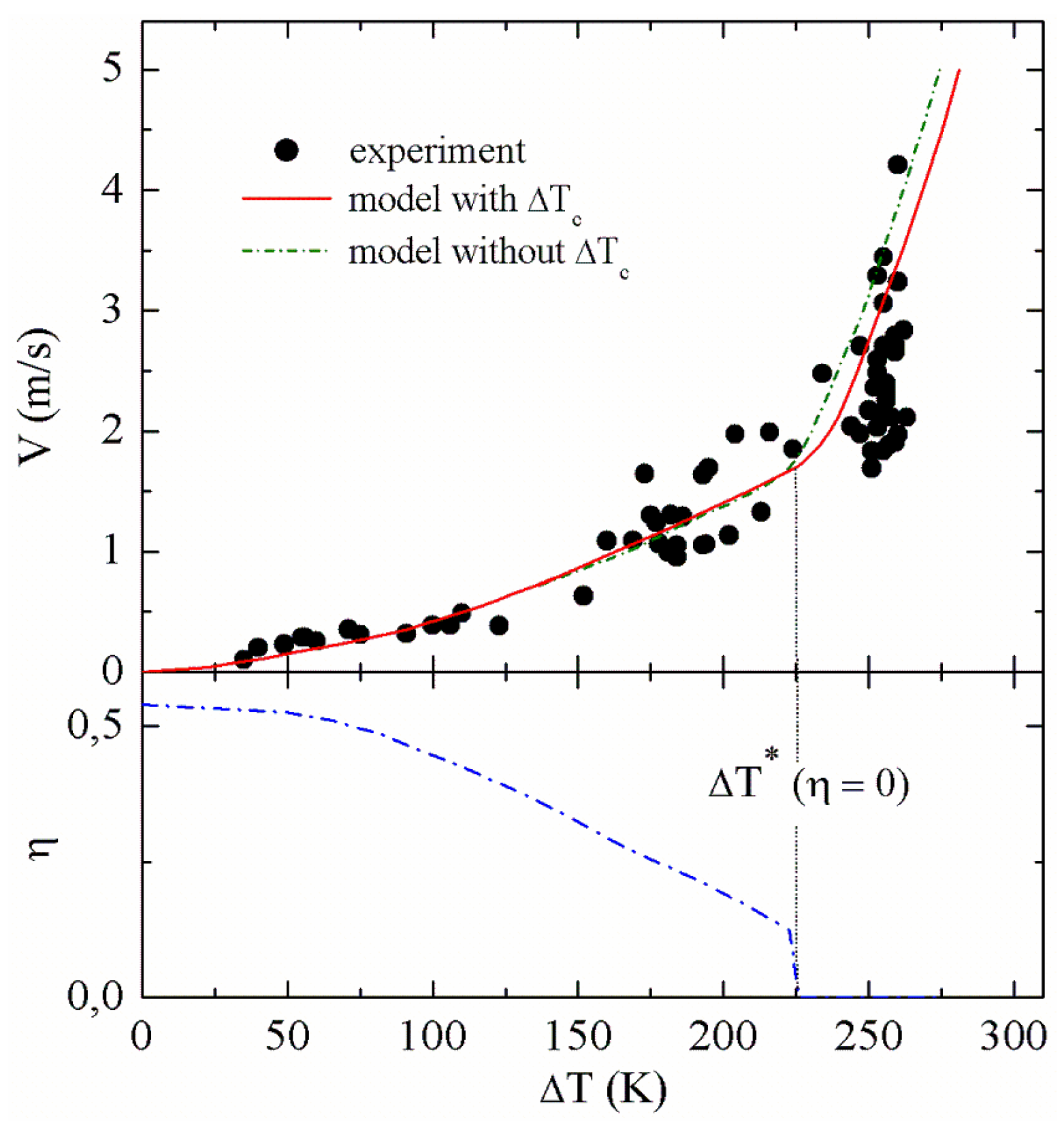 /σ* = 1.675 for the 3D upstream fluid flow imposed on the scale of a freely growing dendrite. Thus, from the two main Equations (6) and (14), the velocity V and the tip radius R of the dendrite can be calculated as a function of the initial undercooling ∆T.