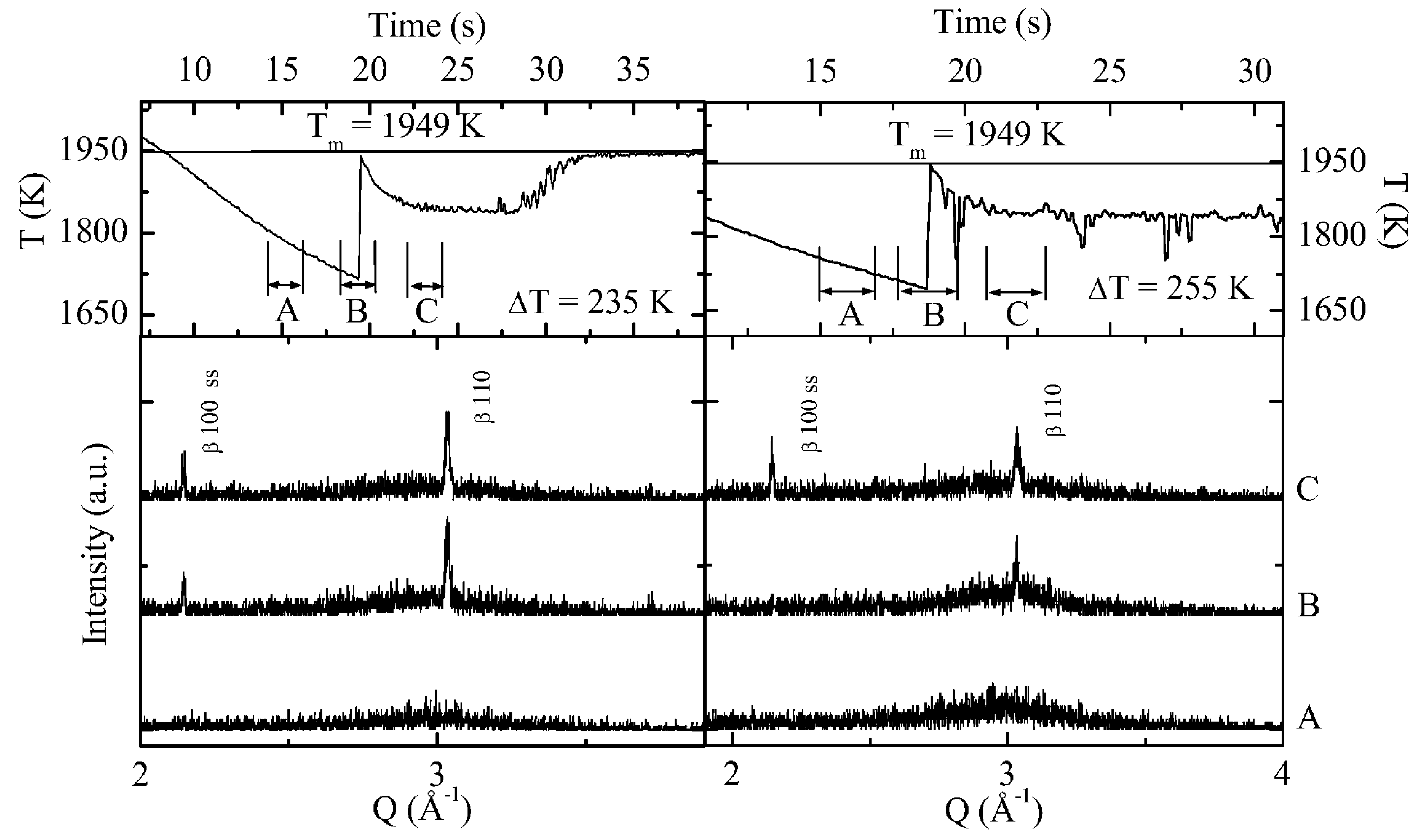 - Shuleshova, O.; Löser, W.; Holland-Moritz, D.; Herlach, D.M.; Eckert, J. Solidification and melting of high-temperature materials: In situ observations by synchrotron radiation. J. Mater. Sci. 2012, 47, 4497–4513. [Google Scholar] [CrossRef]