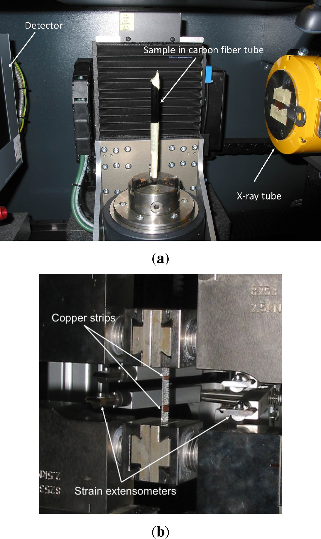 Experimental setup. (a) sample in CT; (b) sample in tensile test machine.