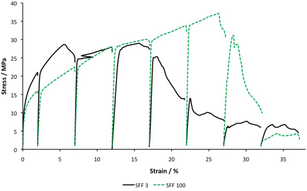 Stress-strain curves of SFF 3 and SFF 100 after eight steps of tensile testing.