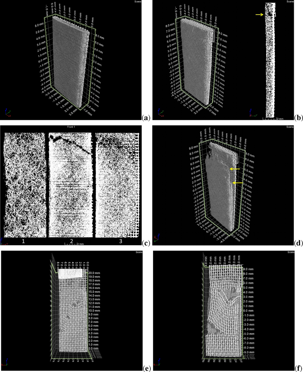SFF 3 After a strain of ϵ = 2%, SFF 3 does not show any damage or changes of the material structure in the CT images. The first structural changes can be observed after a strain of ϵ = 7% as shown in Figure 4b,c. While the outer functional layer (indicated as layer 1) and the layer directly on the support grid (indicated as layer 3) are intact, the middle layer shows a tear perpendicular to the direction of loading (see arrow in Figure 4b). The CT images clearly show how the tear opens in layer 2 and closes again in layer 3. This structural change corresponds to a drop of stress observed in the stress-strain curve of SFF 3. After the middle layer of SFF 3 fails, the stress remains essentially constant (strains between ϵ = 7% and ϵ ≈ 10%) while the two remaining functional layers fail. In this strain range the increase of stress in the wires of the support grid, caused by strain hardening of the metal, compensates for the reduction of the cross-sectional area. However, the tear does not expand into the adjacent layers, but new tears appear in locally weakened areas of the sample. The distance between the failure locations of layer 1 and layer 2 is approximately 4 mm in the Z-direction of the reconstruction as indicated by the arrows shown in Figure 4d. Between these two failure locations the interface between layer 1 and layer 2 delaminated parallel to the direction of loading. Because one clip of the strain extensometer was located near the tear in the outer layer it slipped on the surface resulting in the loop shown in the stress-strain curve. After complete failure of the functional layers (ϵ > 10%) only the support grid is bearing the mechanical load. Then individual wires of the support gird begin to fail in various regions of the sample resulting in multiple tears rather than one tear propagating from a single failure location. It can be observed that wires that were originally oriented perpendicular to the direction of loading rotate into the direction of loading and enable a very high strain after the functional layers and all wires originally in the direction of loading had failed (see Figure 4f). The support grid finally tears apart by a stepwise failure of single wires and failure at the intersections between the rotating wires and the wires that were originally oriented in the direction of loading. This stepwise failure is reflected by the small fluctuations in the last segment of the stress-strain curve.