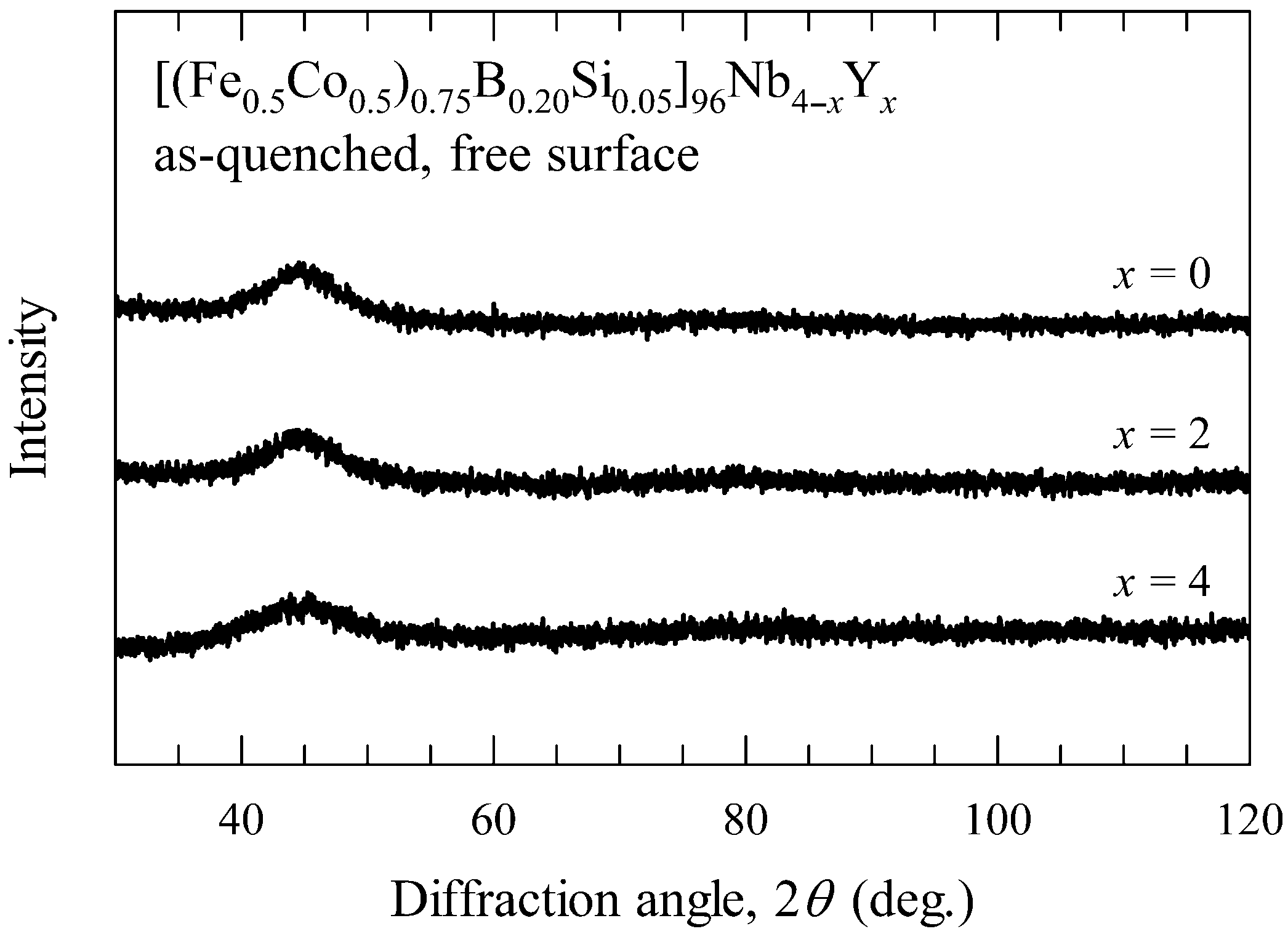 X-ray diffraction profiles of [(Fe0.5Co0.5)0.75B0.20Si0.05]96Nb4−xYx alloys taken from free surface in an as-quenched state.