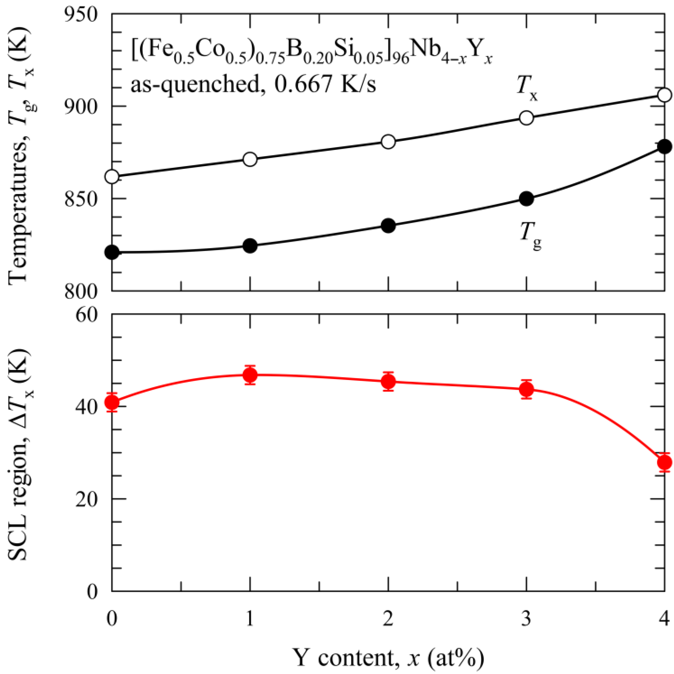 Glass-transition temperature (Tg), crystallization temperature (Tx) and supercooled liquid (SCL) region (ΔTx = Tx − Tg) of [(Fe0.5Co0.5)0.75B0.20Si0.05]96Nb4−xYx alloys as a function of Y content.