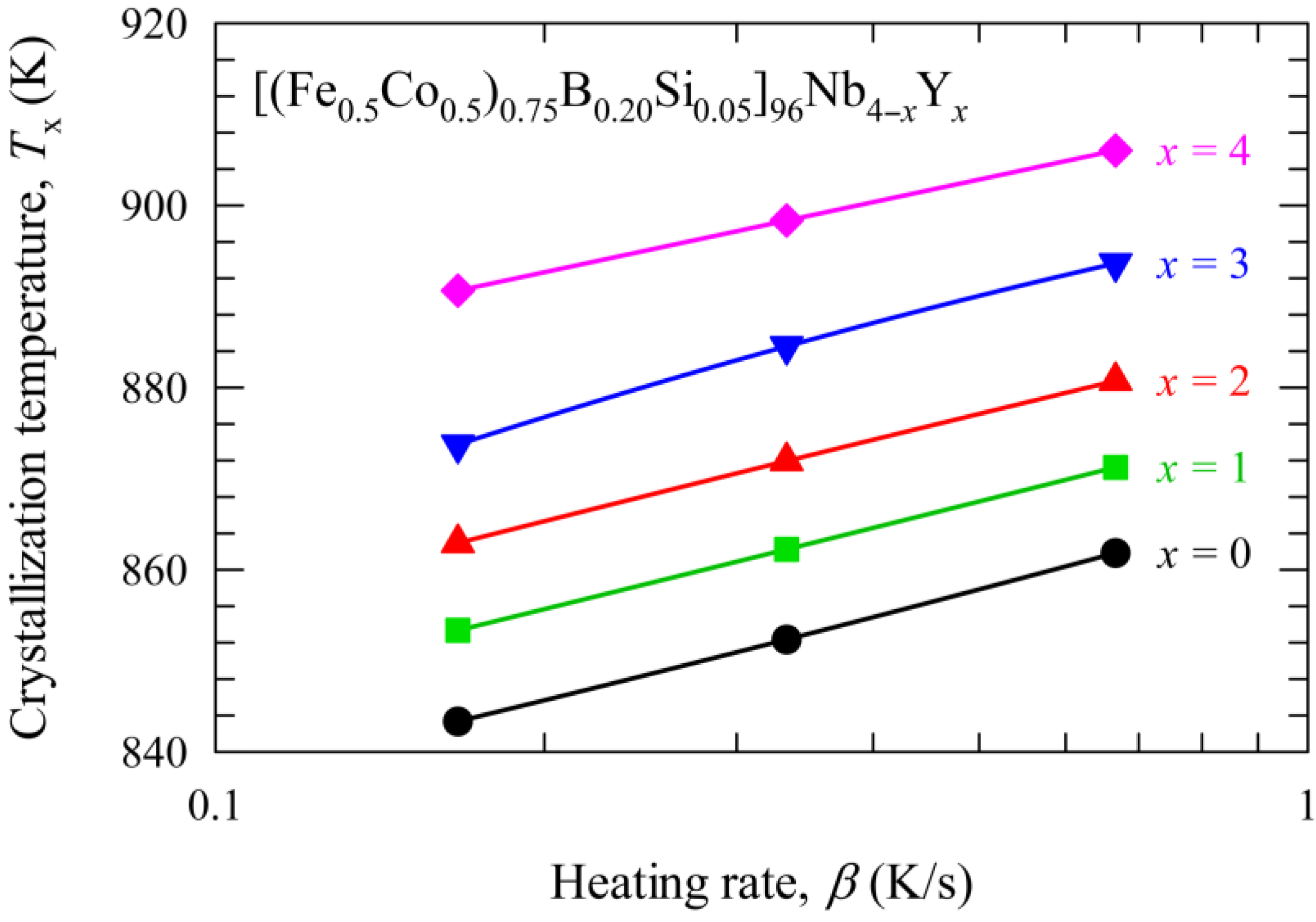Heating rate (β) dependence of the crystallization temperature (Tx) of [(Fe0.5Co0.5)0.75B0.20Si0.05]96Nb4−xYx alloy.