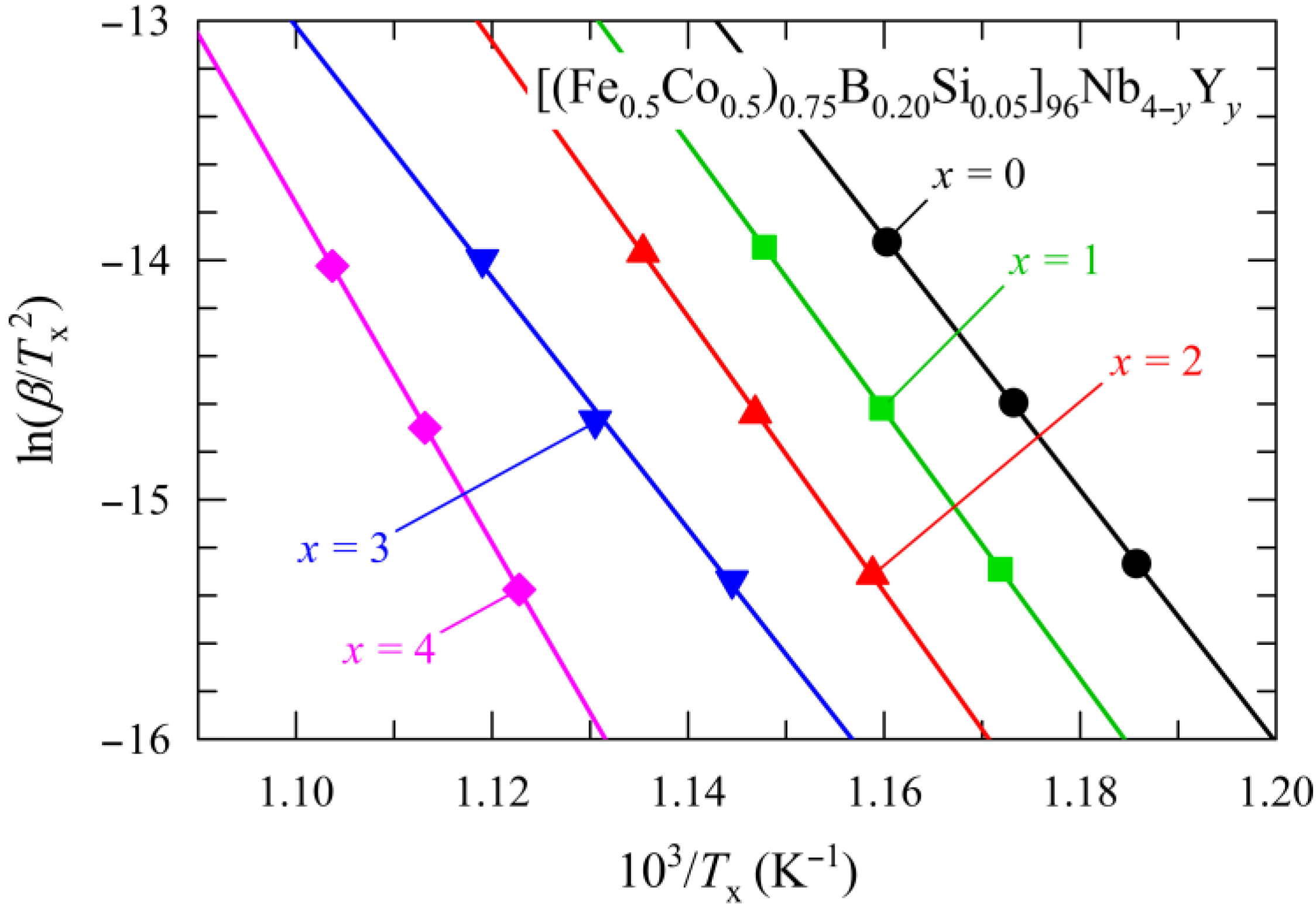 ln(β/Tx2) vs. 1/Tx plot for [(Fe0.5Co0.5)0.75B0.20Si0.05]96Nb4−xYx alloys.