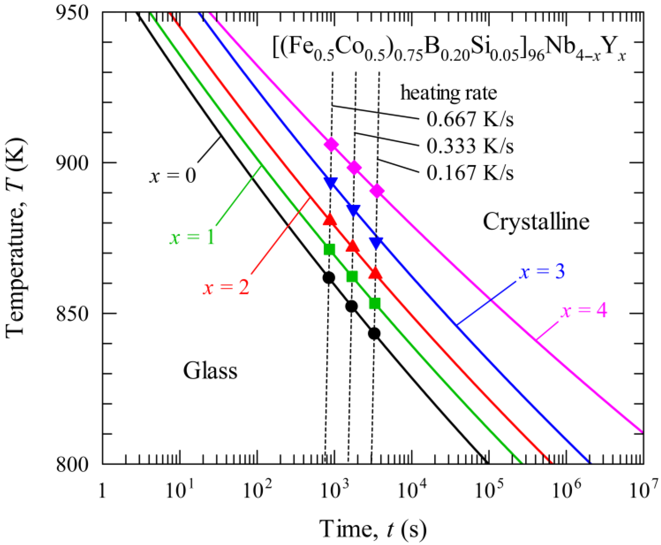 Continuous heating transformation (CHT) diagram of [(Fe0.5Co0.5)0.75B0.20Si0.05]96Nb4−xYx alloys. The symbols represent the experimental values of the onset temperature of crystallization (Tx) obtained by the differential scanning calorimetry (DSC) in the continuous heating.