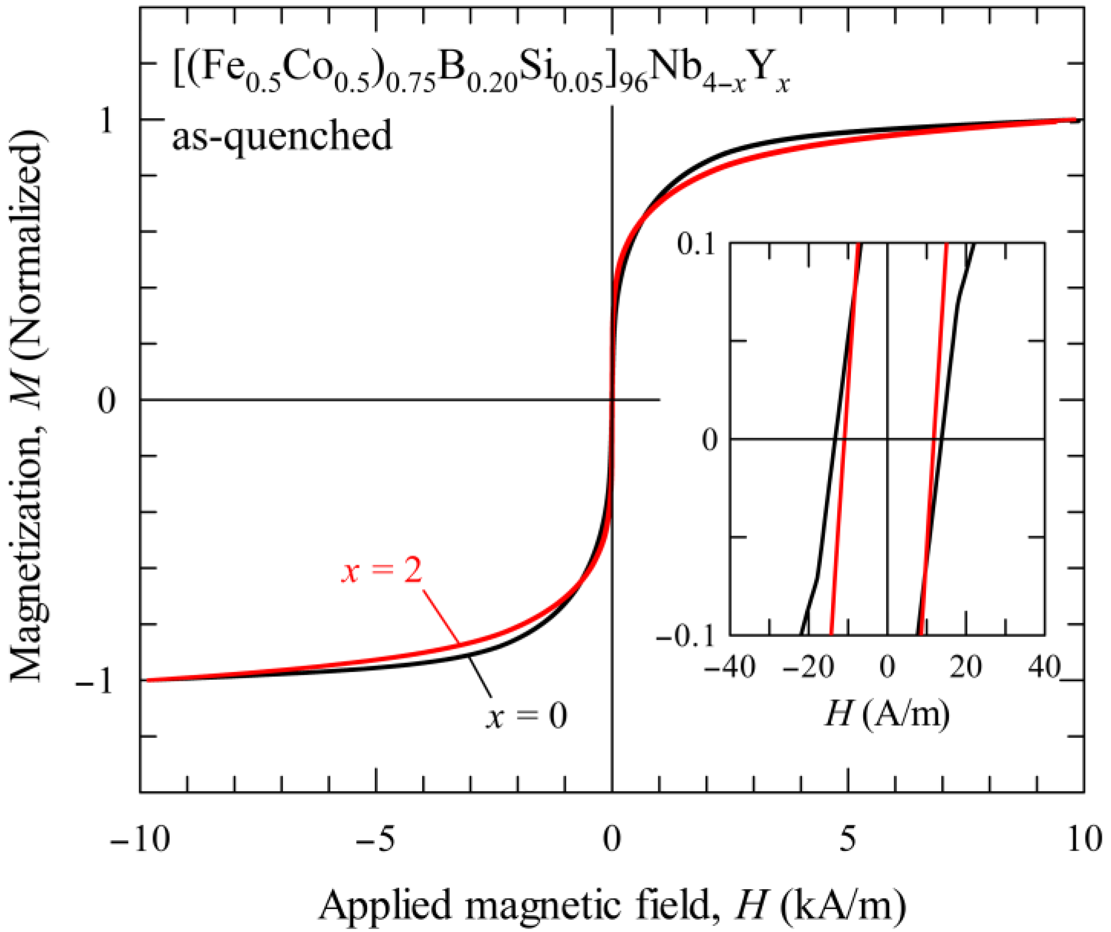 Figure 7 shows the examples of the hysteresis loops of the alloy with x = 0, 2 in an as-quenched state. The hysteresis loops indicate that the alloys exhibit the good soft magnetic properties, i.e., low coercivity (Hc) and high permeability. Figure 8 shows Hc in an as-quenched state as a function of the Y content. The coercivity gradually decreases with increasing the Y content. This result suggests that the soft magnetic properties are improved by replacing Nb with Y, which means the increase of GFA. This is considered to be due to the reduction of the free volume in an amorphous phase [2,3,4].