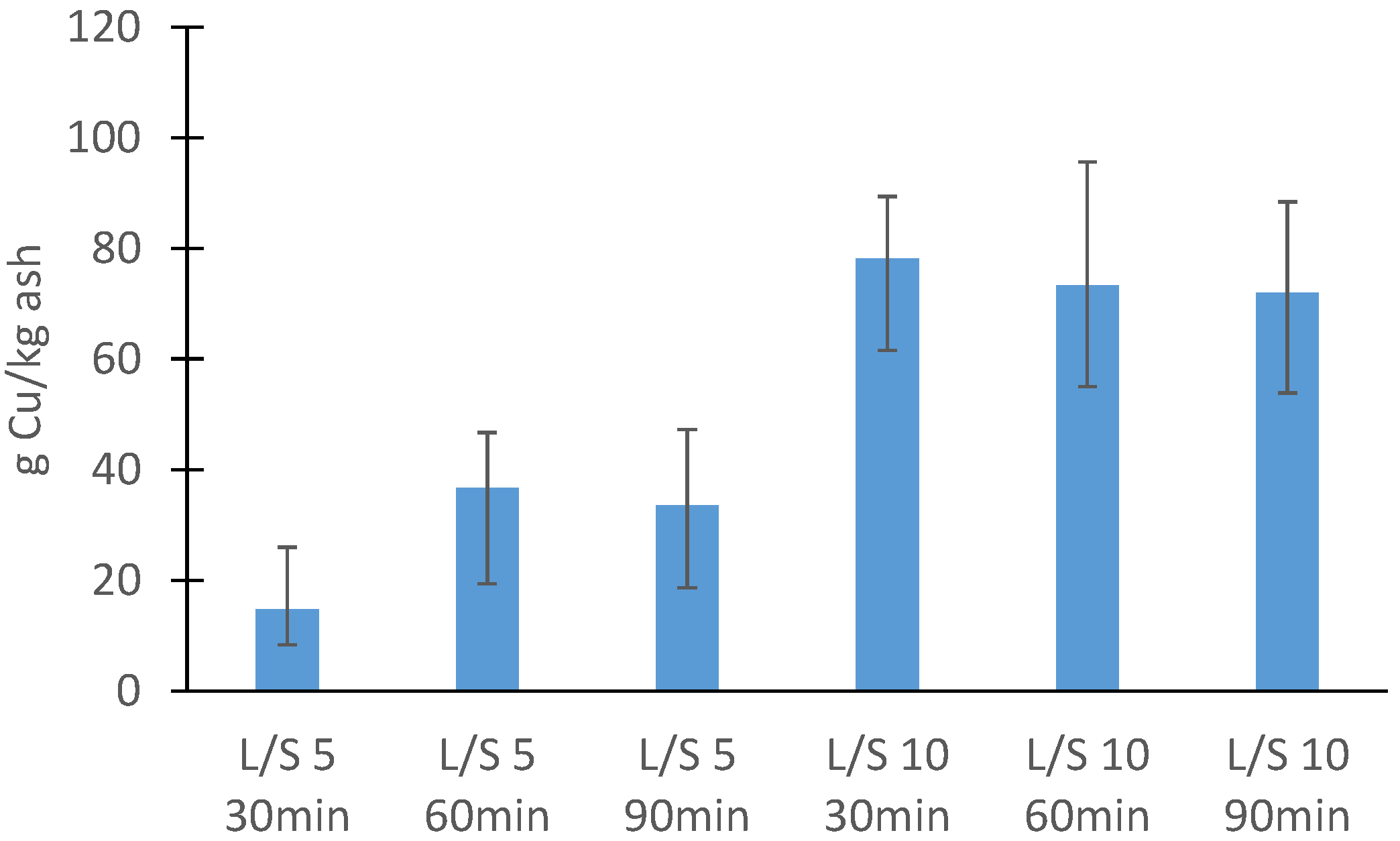 Cu leached from the bark-ash sample A1 with a variation in leaching time (30–90 min) and L/S-ratios (5 and 10). The columns show the average of three replicate tests. The error bars show the maximum and minimum values.