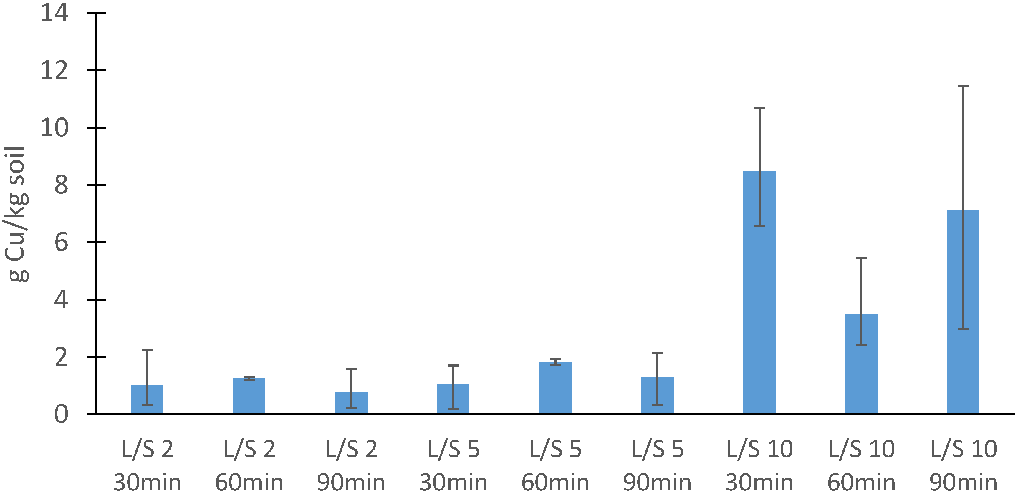 Cu leached from the A2 soil sample at varying leaching times (30–90 min) and L/S-ratios (2, 5 and 10). The columns show the average of three replicate tests. The error bars show the maximum and minimum values.
