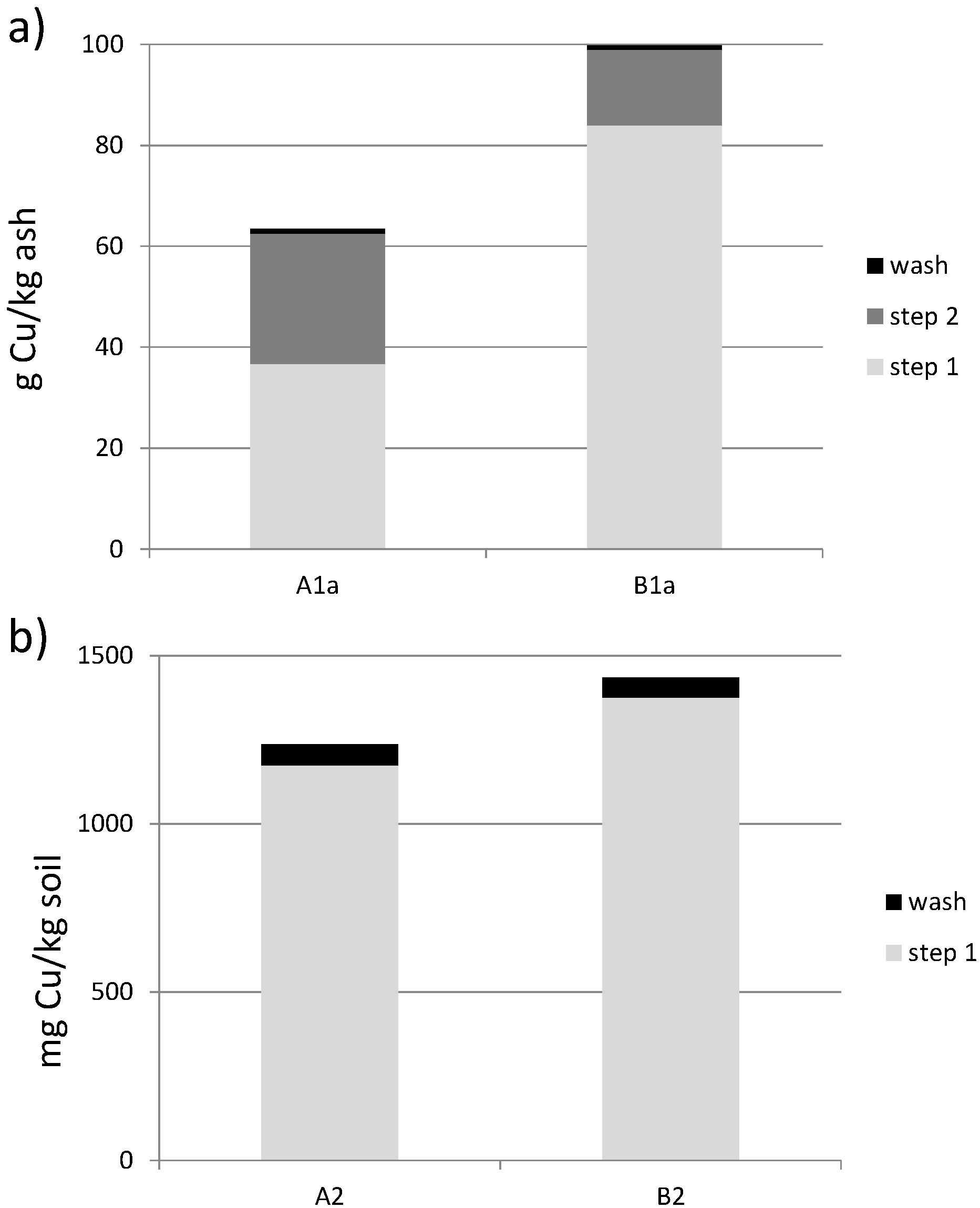 Batch leaching experiments were carried out on samples A1a, A2, B1a and B2, in two 30 min steps with an L/S = 10. The concentrations of selected elements in the respective leachates are presented in Table 2. It should be noted that the concentrations include the total Cu present in the leachates, i.e., Cu originally present in the process water, is included (Table S1). Al, Pb and Zn were the only other measured elements present in significant amounts.