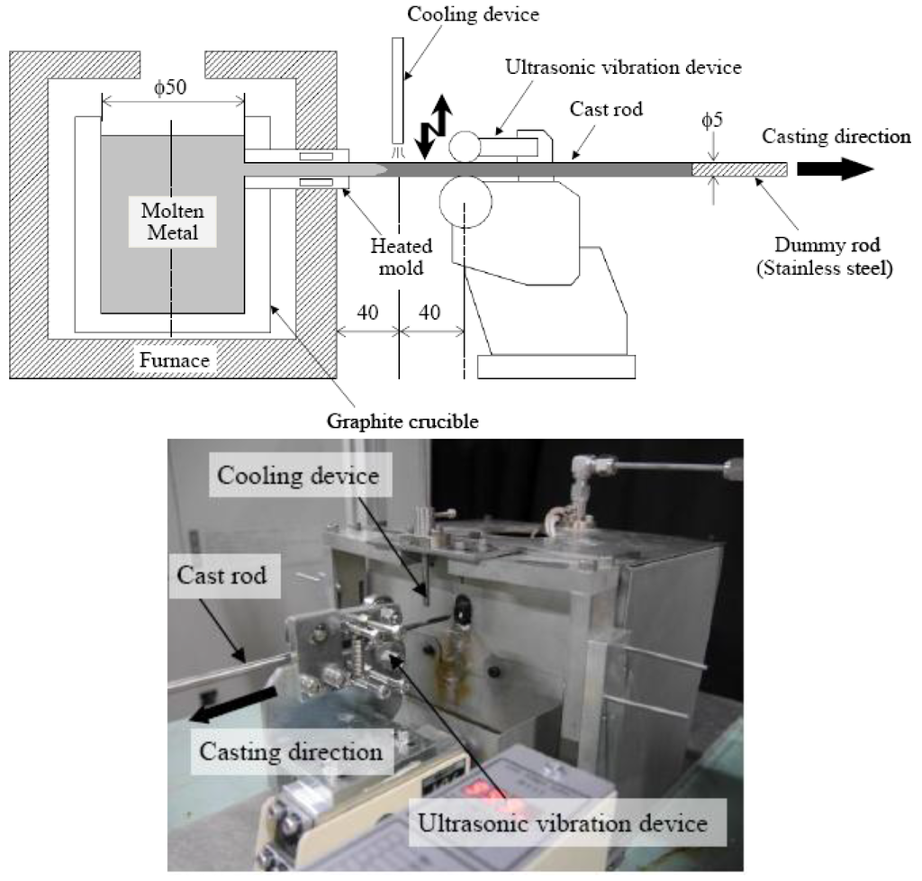 From the above previous work, it appears that a number of experimental works have been conducted to produce high-quality cast Al alloys using the UV process [3]. However, the present authors believe that there is still a requirement for new casting technologies using UV devices. This is because, in the previous studies, UV was conducted only to the melt in crucibles and molds. Although several researchers have done excellent studies to understand the UV effect on the mechanical properties for Al alloys, we believe that there is still opportunity to study the vibration effects on the material properties. This is because the associated examinations have been executed under limited vibration conditions, e.g., a few vibration amplitudes and frequencies.