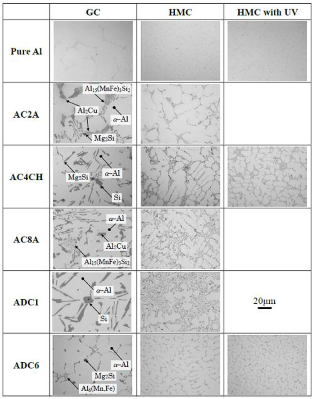 Figure 2 shows the optical micrographs for various cast samples created by gravity casting and the continuous casting with and without ultrasonic vibration. It can be seen that the microstructures for all Al alloys basically consist of α–Al phases and various eutectic structures although those eutectic phases are different depending on the alloy. Coarse α–Al phases and largely grown needle shape eutectic structures are observed in between the grain boundaries for the gravity cast (GC) samples, while small α–Al grains with fine eutectic structures are created in the heated mold continuous cast (HMC) samples. Such different grain size is made by the different cooling rate arising from the different alloy elements (solid-liquid coexisting region). To quantify this, the secondary dendrite arm spacings (SDAS) with standard deviation (S.D.) for all samples were examined, and the obtained data are summarized in Table 2. In this case, SDAS was determined by the average SDAS measurements of more than 100 dendrite cells. As seen, SDAS for HMC is overall smaller than that for GC. Note that the different SDAS is observed for the HMC samples depending on the Al alloy despite the same cooling process. The cooling rates (CR), estimated by CR = 2 × 104 SDAS−2.67 [13], are 6.4 K/s for GC-AC8A, 135.1 K/s for HMC-AC8A, 0.9 K/s for GC-ADC6 and 23.6 K/s for HMC-ADC6. This is caused by different alloy elements. Figure 2 also depicts the optical micrographs for the HMC samples with ultrasonic vibration (pure aluminum, AC4CH and ADC6). The α–Al grains seem to be altered by UV to make a finer spherical shape. This occurrence was similarly reported in the previous work [8].