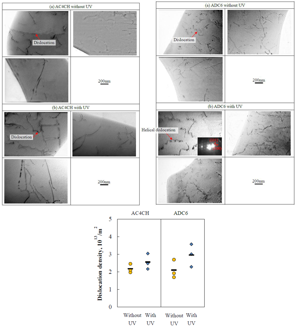 Figure 4 displays TEM images of the ADC6 samples with and without UV process. It is obvious that the dislocation of the cell boundaries is observed in the HMC–sample with and without UV process. An increment of the dislocation density is clarified in the cast samples with the ultrasonic vibration process. To quantify this, the dislocation density was measured by the total dislocation length L (m) in a cube of side l (m), which is divided by the volume of the cube l3 (m3), where the dislocation density is L/l3 (m−2). The mean dislocation density value measured is 2.1 m−2 for the without UV process of ADC6, which is much lower than those for the UV–HMC samples, e.g., 3.0 m−2. It is interesting to mention that spiral dislocation loops, i.e., helical dislocation, can be seen in the UV samples. This would have been made by the force arising from the vibration, and these spiral dislocations are found to be related to the direction of the <100>. Such helical dislocations are associated with screw dislocation [14].