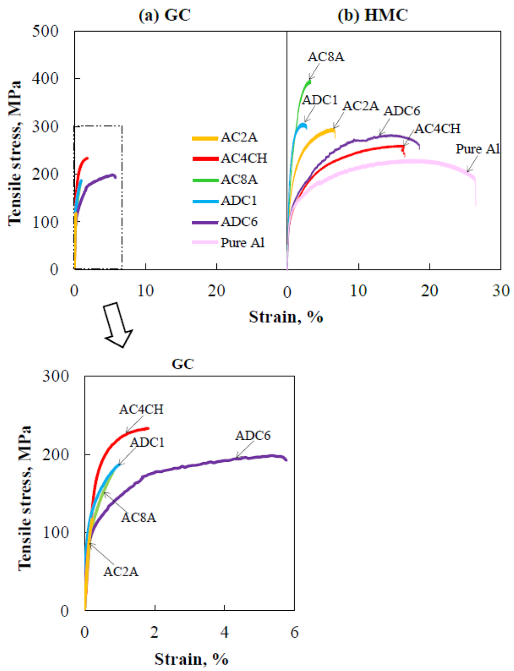 Representative tensile stress versus tensile strain curves for cast aluminum alloys: (a) GC and (b) HMC.