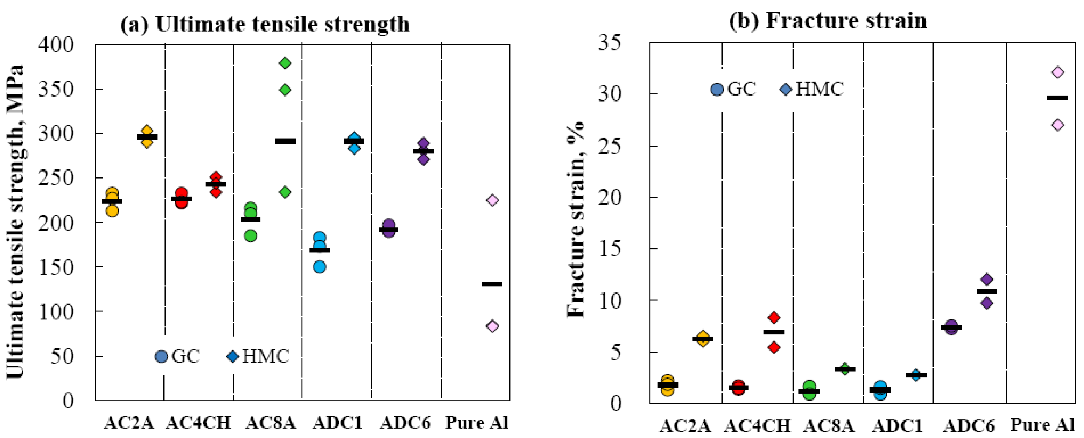 Tensile properties of cast aluminum alloys: (a) ultimate tensile strength and (b) fracture strain.