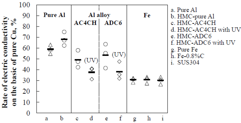 On the basis of the crystal orientation for our HMC samples, it was considered that excellent electric conductivity (EC) of the HMC samples could be obtained. To verify this, the EC values for our cast samples were measured by a LCR meter (ZM2353, NF Corporation, Kanagawa, Japan) using the samples of 1 mm × 100 mm, machined from the original cast sample. Moreover, to identify this more clearly, the EC measurements for other materials, such as wrought pure copper, pure iron, Fe–0.8%C, SUS304 and wrought pure aluminum, were executed. Figure 7 shows the electric conductivity (EC) of all samples, which are indicated with the rate of electric conductivity based upon the pure copper one. It is clear that the electric conductivity for the wrought pure aluminum is about 40% lower than that for the pure Cu, while that is higher than that for the Fe ones (pure Fe, Fe–0.8%C and SUS304). The electric conductivity for the HMC–pure aluminum is about 10% higher compared to that for the wrought pure aluminum. This may be attributed to the uniformly organized crystal orientation as mentioned above. As for the aluminum alloys (HMC–AC4CH and –ADC6), their EC values are lower than those for the pure aluminum. With the UV process for HMC–AC4CH and –ADC6, the EC level decreases about 25%, compared to that for the same sample without UV. This would have been affected by the randomly distributed lattice structure.
