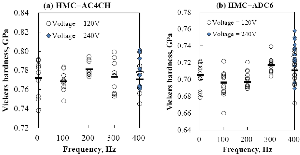 Vickers hardness of the HMC–ADC6 alloys increases with increasing UV frequency (400 Hz). Furthermore, high hardness is obtained for the cast Al alloys vibrated at a high amplitude (240 V).