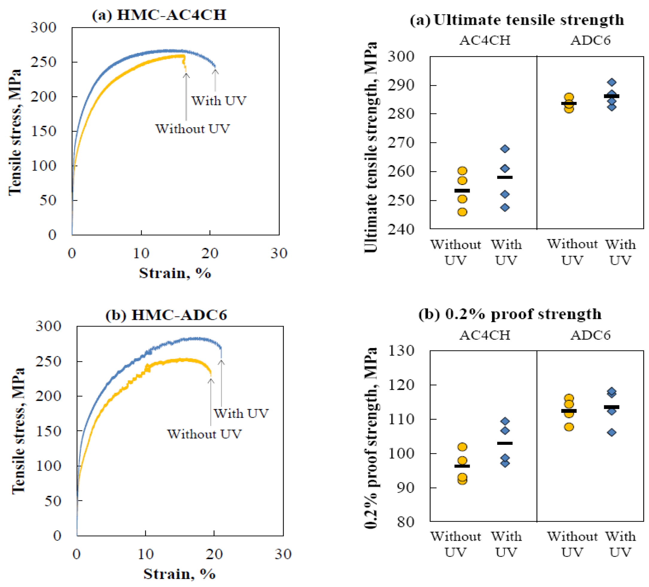 Figure 9 depicts the representative tensile stress-versus-strain curves for HMC–AC4CH and HMC–ADC6 with and without the UV process, and, based upon their stress-strain curves, ultimate tensile strength, and 0.2% proof strength for both AC4CH and ADC6 samples and also summarized in Figure 9. As seen, tensile strength slightly increases for both UV samples. The mean σUTS and σ0.2 for the UV samples are a few percent higher than those for the same Al alloy without UV. Such increment of the tensile strength would be caused by the change of their microstructural characteristics, as mentioned above. Note, due to the scattered data, no clear difference in the material ductility is detected. The reason behind this will be dealt with in the future.