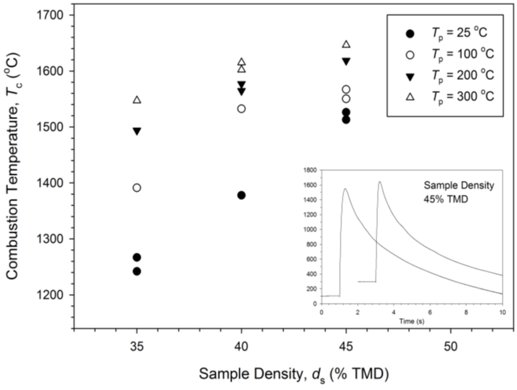 The dependence of the combustion front temperature (Tc) on sample density and preheating temperature is presented in Figure 3. According to the typical temperature profiles plotted in the insert of Figure 3, the abrupt rise in the temperature represents rapid arrival of the reaction front and the peak value signifies the combustion front temperature. Data points in Figure 3 signify the combustion front temperatures. In the insert, two temperature profiles measured from 45% TMD samples with Tp = 100 and 300 °C are presented. It is evident that the increase of preheating temperature increases the reaction temperature. As shown in Figure 3, for the samples without prior heating (Tp = 25 °C), the increase of sample density from 35% to 45% TMD significantly increased the peak combustion temperature from 1240 to 1530 °C. This could be attributed to a lesser amount of heat dissipated within the voids of the porous compact. As a result, the energy flux sustaining the combustion wave propagation was augmented. The combustion front temperature was also increased by preheating the sample. It was found that a more substantial increase of the combustion front temperature by preheating the sample was observed for the sample with a lower compaction density. Likewise, the influence of sample density was more pronounced for the sample with a lower preheating temperature. The highest combustion temperature reaching up to 1645 °C was measured from the sample of 45% TMD at Tp = 300 °C.