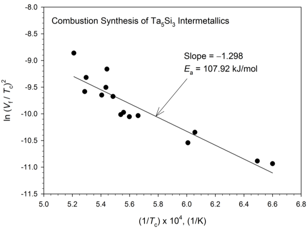 Activation energy (Ea) of combustion synthesis of Ta5Si3 determined from a relationship between combustion front velocity (Vf) and temperature (Tc).