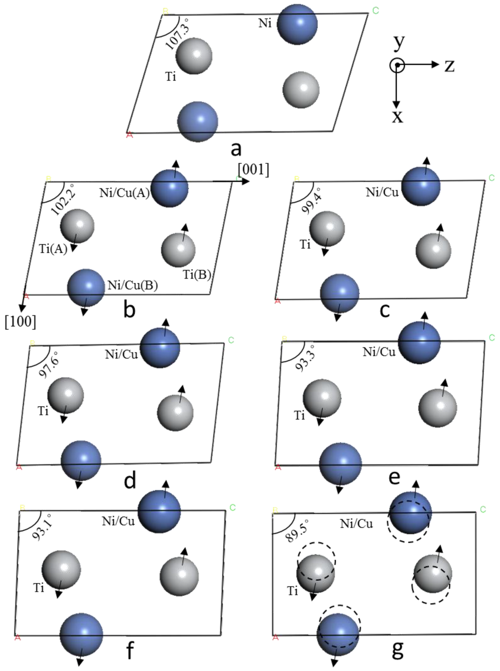 The three-dimensional (3D) diagrams are shown in Figure 3. From this figure, it is obvious that all the atomic displacements occurred with (010) planes, i.e., (010) plane at y = 0.25 (as listed in Table 2) and (010) plane at y = 0.75, respectively. We label the atoms within the (010) plane at y = 0.25 as Ni/Cu(A) and Ti(A), and the atoms within the (010) plane at y = 0.75 as Ni/Cu(B) and Ti(B), respectively. As shown in Figure 2, the Ti atoms on the left and right sides are Ti(A) and Ti(B), respectively, while the Ni/Cu atoms in upper and lower positions are Ni/Cu(A) and Ni/Cu(B), respectively. The monoclinic angles and the atom displacement directions are indicated in these two figures.