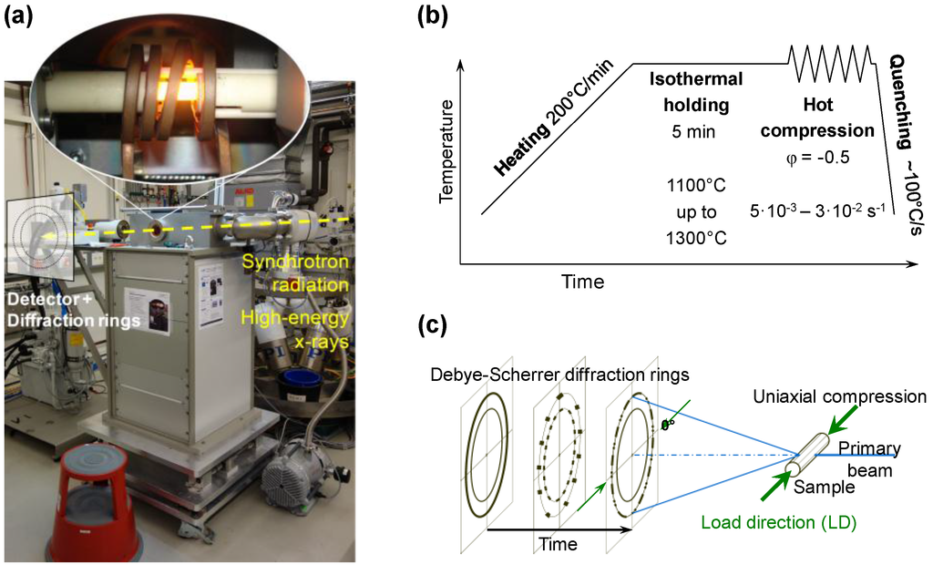 Over the last decade, new high-energy synchrotron sources were constructed, which, in combination with advanced sample environments, provide novel tools and analysis methods for engineering and materials science [,,]. Such synchrotron sources offer the possibility for time-resolved in situ studies during materials processing [,]. In the current paper we have used a deformation dilatometer that has been modified for working in the synchrotron beamline to perform hot-compression experiments. In situ high-energy X-ray diffraction (HEXRD) measurements were performed during hot-forming. This setup enables an in situ observation of the interaction and evolution of several microstructural parameters during processing. In particular, we can directly observe the evolution of crystallographic texture, phase fractions, or grain size during deformation and simultaneously record the process parameters, like temperature, force, and length change. Thus, we have been able to systematically analyze texture evolution of a multi-phase alloy in different phase fields, both in situ and time resolved.