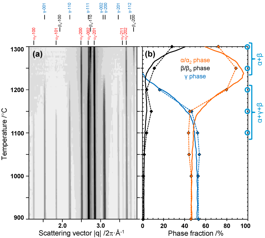 Phase constitution as a function of temperature for Ti-42Al-8.5Nb. (a) Evolution of the diffraction patterns during heating; (b) Phase fractions determined by Rietveld analysis. Continuous lines: heating rate of 10 °C·min−1. Dashed lines: stepwise heating.