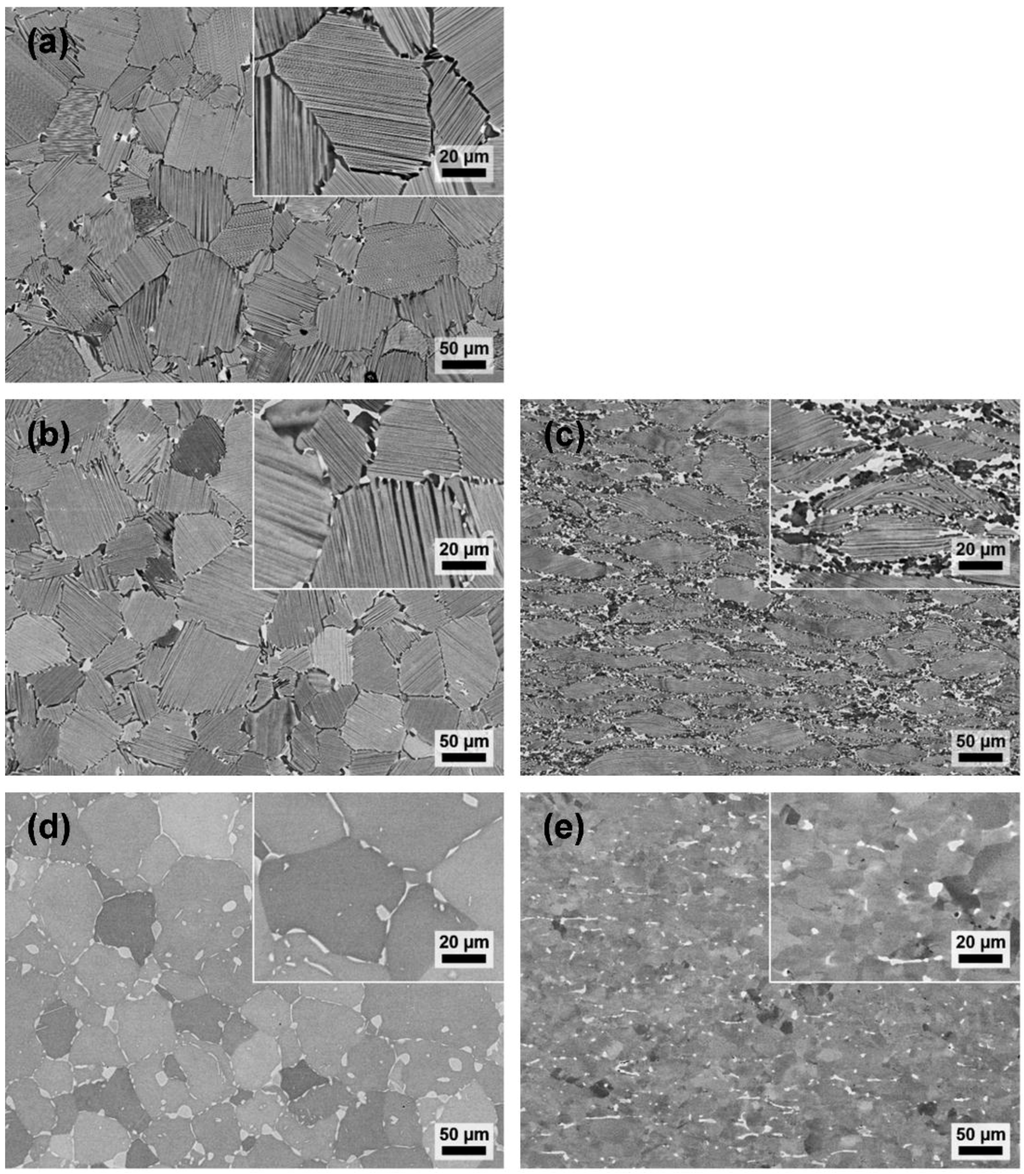 The starting material (Figure 3a) consists of large (α2 + γ) lamellar colonies with a diameter of 50–100 μm. Additionally, a few small globular γ and β grains can be observed at triple points and colony boundaries. This relatively coarse grained microstructure can be attributed to HIPing at 1250 °C which is almost in a single-phase α phase field and the subsequent slow furnace cooling.