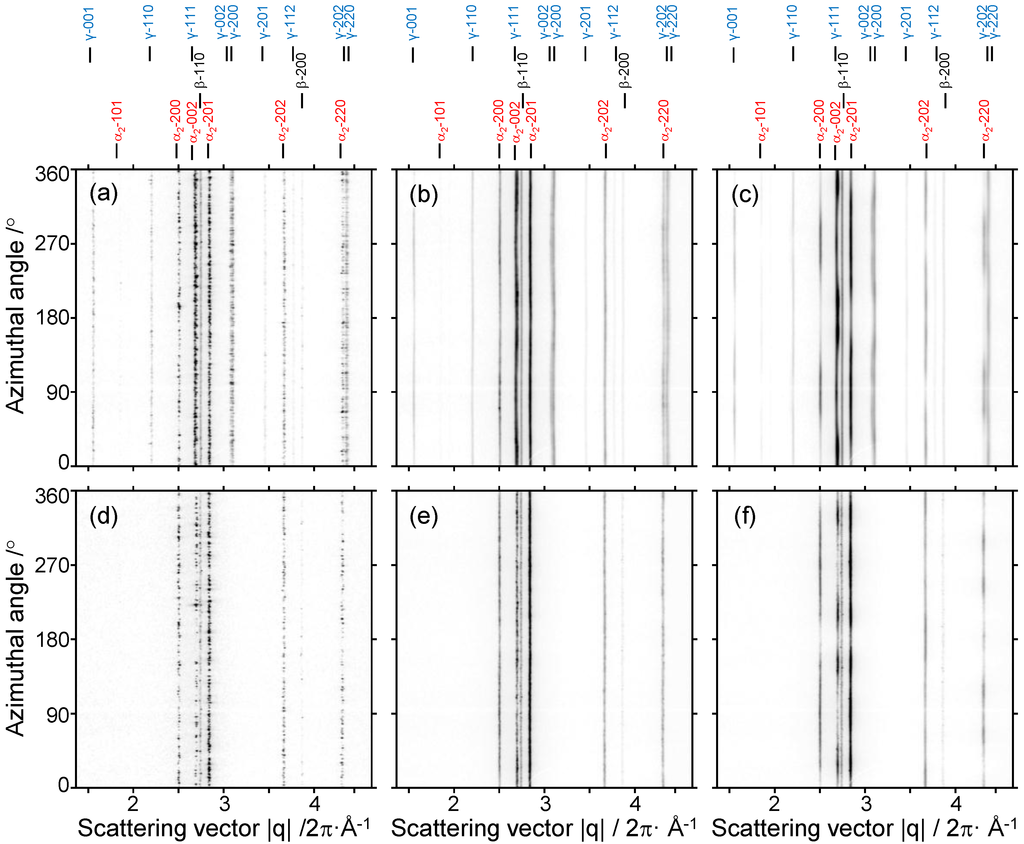 Unrolled diffraction rings taken during two hot forming experiments at (a–c) 1150 °C; (d–f) 1250 °C; (a,d) before deformation; (b,e) after 10%; and (c,f) after 30% deformation. The reflections of the various phases are indicated at the top of the figure.
