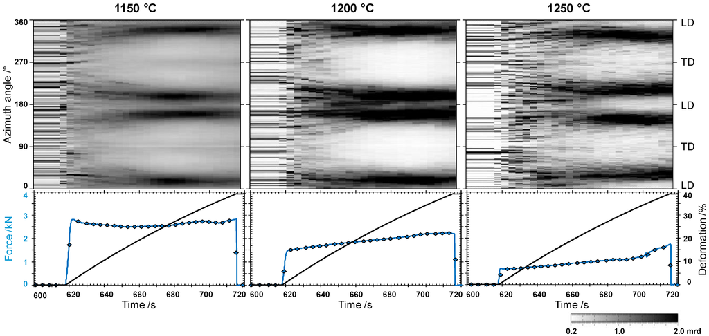 Azimuth angle vs. time diagrams for the α-002 reflection during hot compression at 1150 °C, 1200 °C, and 1250 °C using a compression rate of 5 × 10−3·s−1. The azimuthal orientation distribution is coded using a greyscale. The process parameters of force and deformation are indicated below the diagrams. LD: Load direction. TD: Transverse direction.
