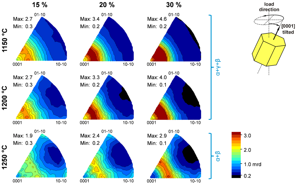 Figure 6 shows the evolution of the α phase deformation texture during the above discussed experiments, using inverse pole figures in load direction. They show the frequency distribution of crystallographic directions in the load direction. The inverse pole figures after deformation of 15%, 20%, and 30% are presented for each forming temperature. Obviously, the intensity and sharpness of the deformation texture increases during each experiment. The inverse pole figures show that only directions within a certain distance to the c axis [0001] are aligned in load direction. This is the typical appearance of the tilted basal fiber texture as sketched on the right side in Figure 6. It is a typical deformation texture that is formed during compression of hexagonal phases like the α phase [].