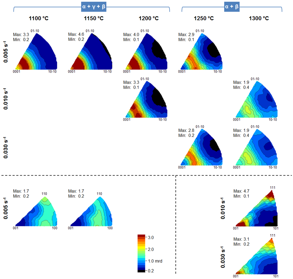 Figure 7 illustrates inverse pole figures, obtained after 30% deformation at different temperatures, as well as with different deformation rates. The upper part shows the α phase which is the dominant phase during deformation within the temperature range employed. The lower part of the figure shows inverse pole figures for the γ phase for tests performed at 1100 °C and 1150 °C and of the β phase at 1300 °C. The inverse pole figures for γ and β could be calculated due to their high volume fraction at these temperatures. The deformation texture of the tetragonal γ phase consists of weak <110> and <302> fibers. These are typical compression texture components of γ which have already been described in many previous articles [,]. The cubic β phase forms significant <001> and <111> fibers which are typical compression texture components of bcc metals. A significant difference in the α deformation texture can be observed between experiments performed in the 3-phase and in the 2-phase fields. With the higher temperatures in the 2-phase field, the texture becomes weaker and more diffuse and the tilt angle between the load direction and the intensity maximum increases. This can be attributed to the larger amount of ductile β phase which has a higher number of slip systems than the hexagonal α phase. Thus, the β phase takes over an increasing part of plastic deformation. This might also explain the strong β deformation texture formed during the experiments at 1300 °C.