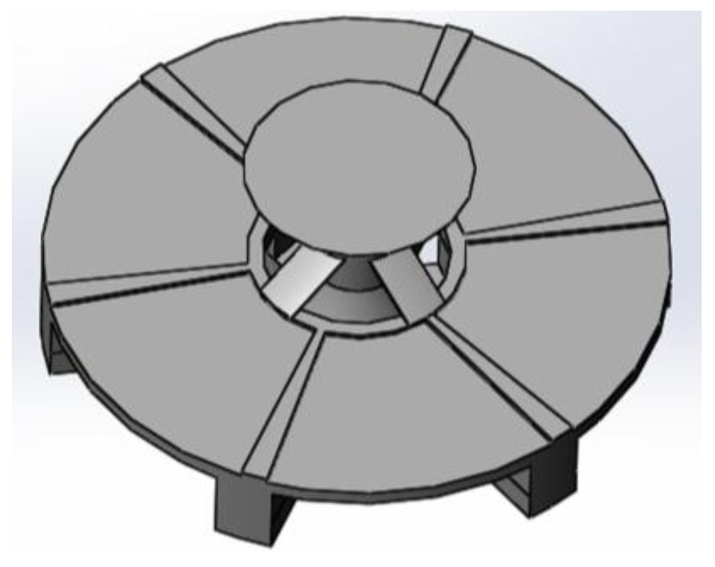 From simulation results and the microstructure of the test casting, the thickness of the disk is too small to be compared with its diameter. Hence, the mold is hardly full with molten alloy in a gravity cast. However, when a centrifugal force is employed, the molten alloy can be easily torn in the flat disk. In this case, the advantage of centrifugal force is weakened. Hence, the main ideas of improvement with respect to the runner system are to provide a sufficient molten alloy to fill the mold and keep the fluid stable. Therefore, it is decided to moderately increase the gate size, as shown in Figure 9.