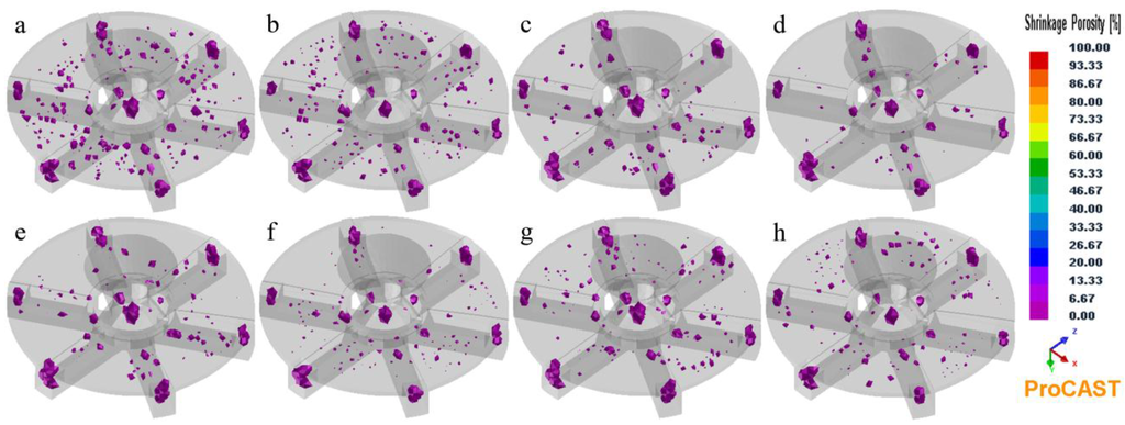 The predicted shrinkage porosity of test castings: (a) mold temperature of 25 °C and gravity casting (short for 25 °C, 0 rpm); (b) 800 °C, 0 rpm; (c) 25 °C, 200 rpm; (d) 800 °C, 200 rpm; (e) 25 °C, 400 rpm; (f) 800 °C, 400 rpm; (g) 25 °C, 600 rpm; (h) 800 °C, 600 rpm.