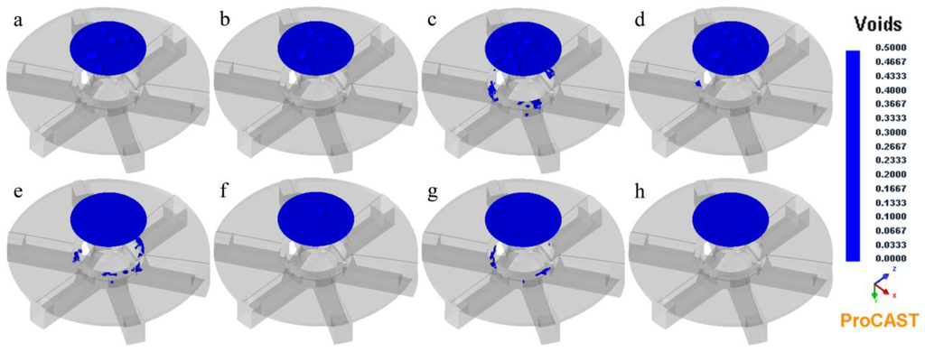Predicted voids of test castings, (a–h), the same as the Figure 2.
