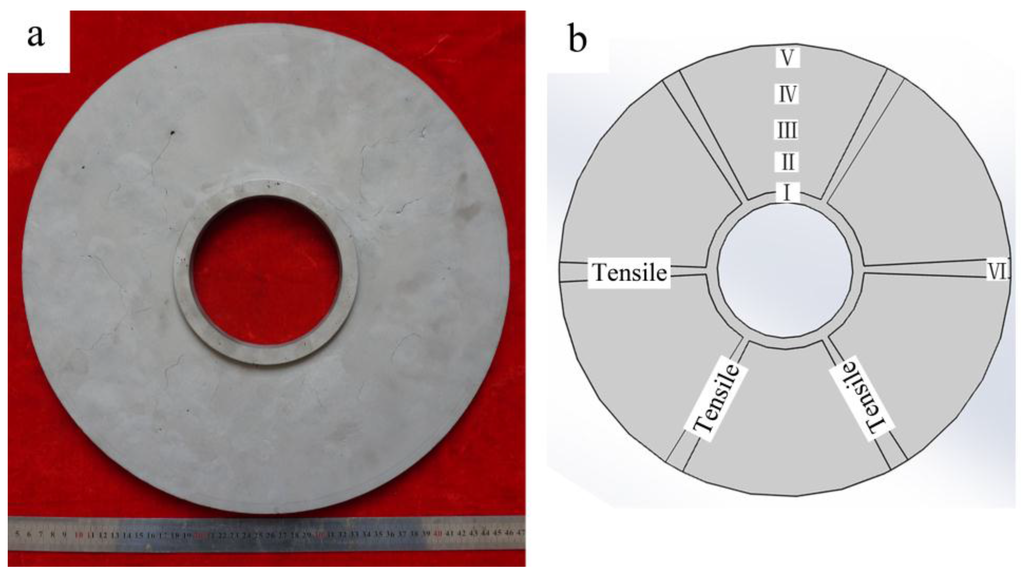The casting of the TiAl alloy grating was a disk with a diameter of 580 mm, which had a 180 mm hole in the center, and a thickness of 10 mm. Initially, we made a small test disk with a diameter of 400 mm, which had a 120 mm hole in the center, and a thickness of 10 mm. In the following text, we refer to full-size casting as the ultimate goal, and test casting as the minor one. All samples for characterization were cut from the test casting. The full-size casting only employed X-ray non-destructive inspection for the porosity in the casting.