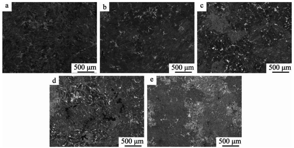 Optical microstructure of test casting (a–e) were from the center hole to the outer edge, and the interval between the two samples measured 20 mm.