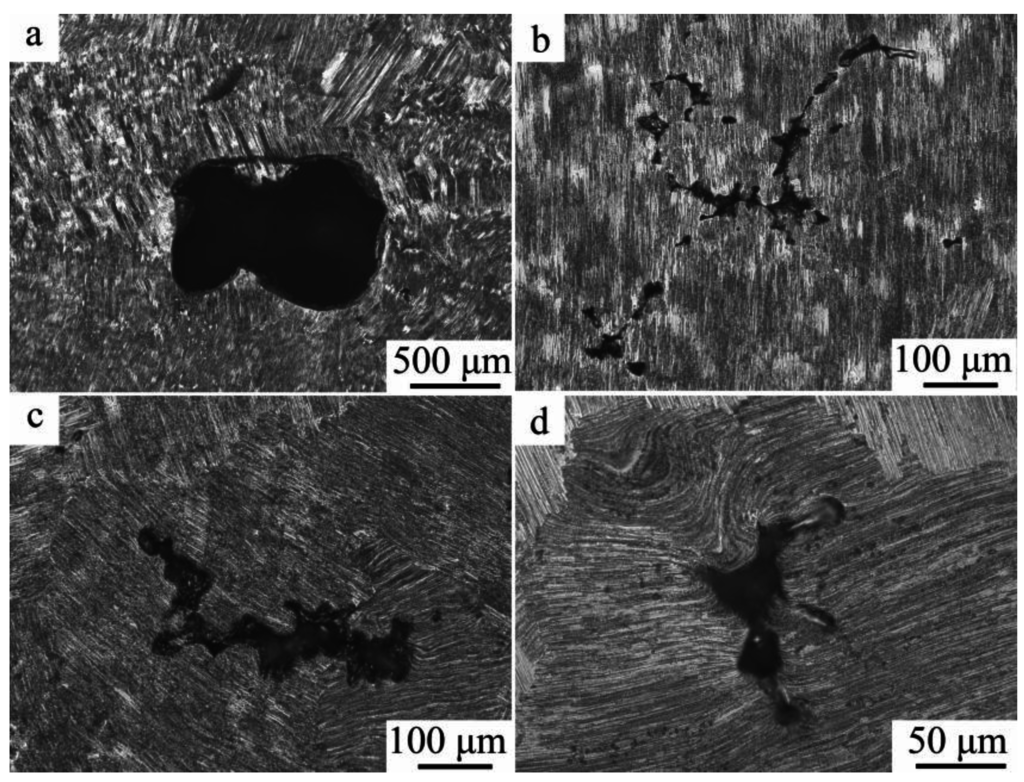 Micro-defects of test casting, (a) pore and (b–d) shrinkage.