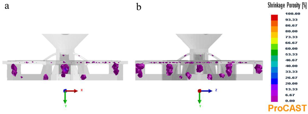 For shrinkage porosity, Figure 2d showed best situation, Figure 2f was the second and Figure 2e was the third. However, Figure 3d,e exhibited voids, and Figure 3f was free of voids. In ProCAST, the voids predicted represent not only air bubbles but also oxide layers trapped in areas where fluid flow is restricted. Hot Isostatic Pressing (HIP), which is a necessary step in the foundry industry, can eliminate voids but does not remove micro-porosity, which means that voids are more serious than porosity. Hence, a mold temperature of 800 °C and a rotation speed of 400 rpm are probably good choices for the test casting, which exhibited porosity slightly more than that observed at a mold temperature of 800 °C and a rotation speed of 200 rpm, albeit free of voids.