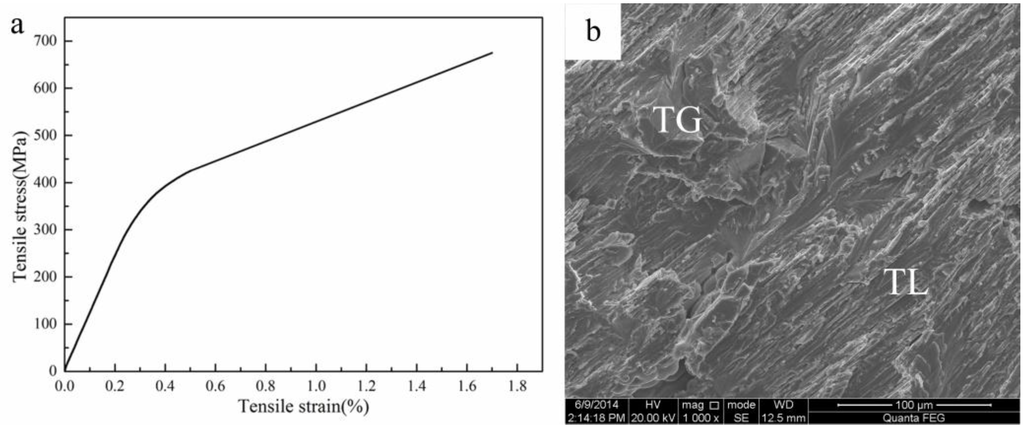 Tensile test stress-strain curve obtained at room temperature (a) and fracture surface (b) of as-cast TiAl specimen, transgranular (TG) and translamellar (TL).