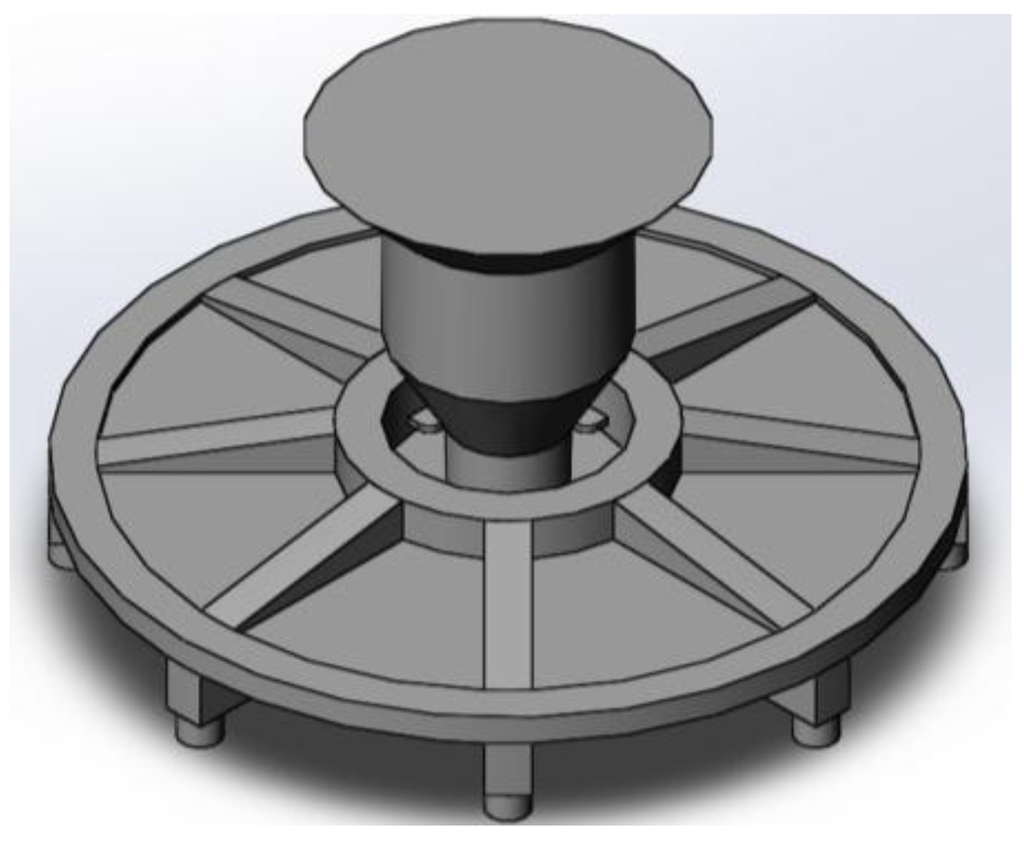 The three-dimensional (3D) model of test casting based on the first design is shown in Figure 1. The mold-filling process and solidification were calculated. All the casting gratings exhibited porosities under different initial conditions, as shown in Figure 2. The results indicated that casting defects are spread throughout the entire cast gratings, and the porosity is considerable. Casting defects are affected by the mold-filling process and the solidification of the cast grating. For a mold temperature of 25 °C and gravity casting, the worst results are obtained from the simulation (Figure 2a), and a large amount of shrinkage pores are spread throughout the entire cast grating. With the increase in the mold temperature to 800 °C, the situation improves slightly (Figure 2b). Moreover, when a centrifugal casting is employed, the situation significantly improves at rotation speeds of 200 rpm and 400 rpm (Figure 2c–f). However, with the increase in the rotation speed to 600 rpm, the amount of shrinkage pores increases (Figure 2g,h).