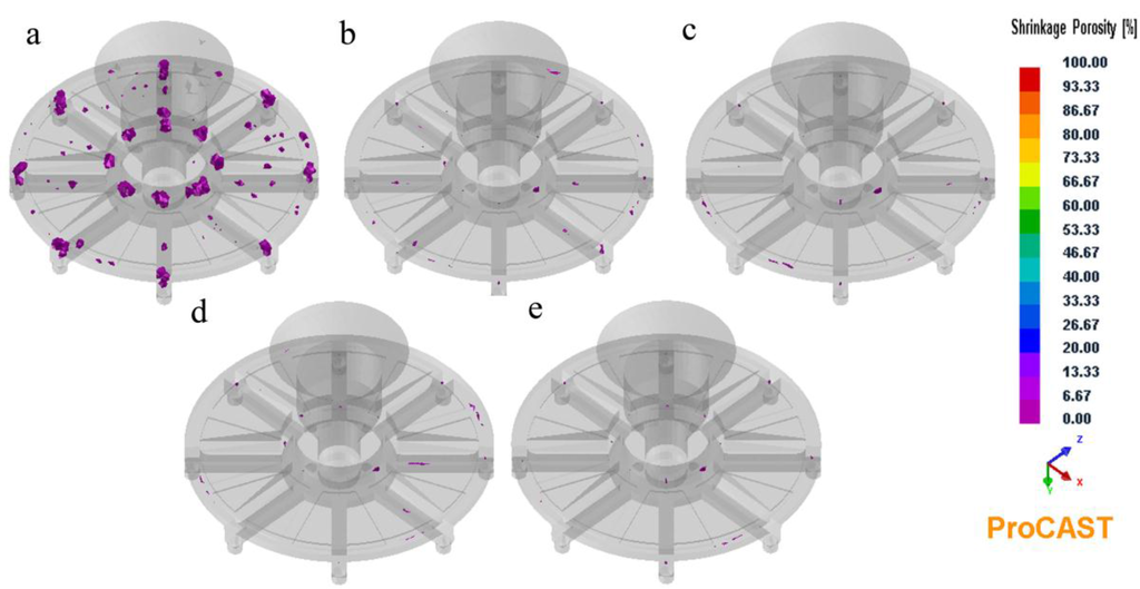 The predicted shrinkage porosity of full-size castings, (a) mold temperature of 600 °C and gravity casting (short for 600 °C, 0 rpm); (b) 200 °C, 200 rpm; (c) 400 °C, 200 rpm; (d) 600 °C, 200 rpm; (e) 600 °C, 400 rpm.