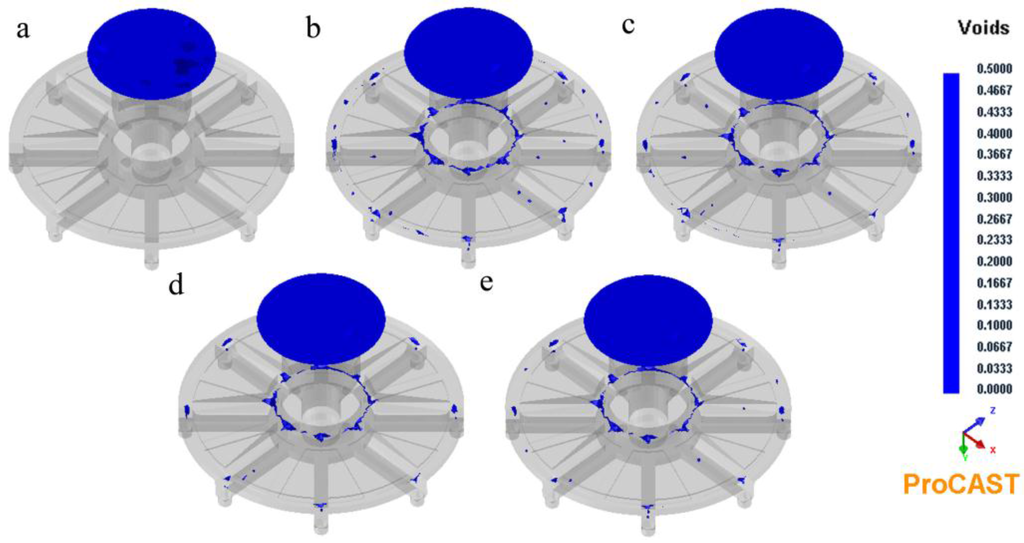 Predicted voids of full-size castings, (a–e) the same as the Figure 10.