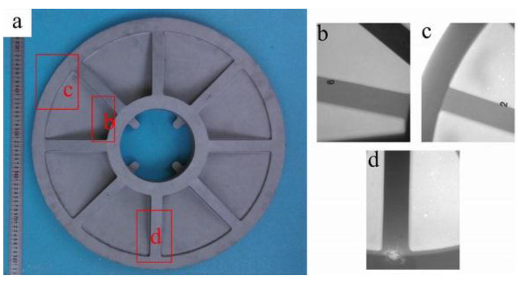 X-ray nondestructive inspection results of full-size casting, (a) the grating casting and (b–d) correspond to b, c and d areas on (a), respectively.